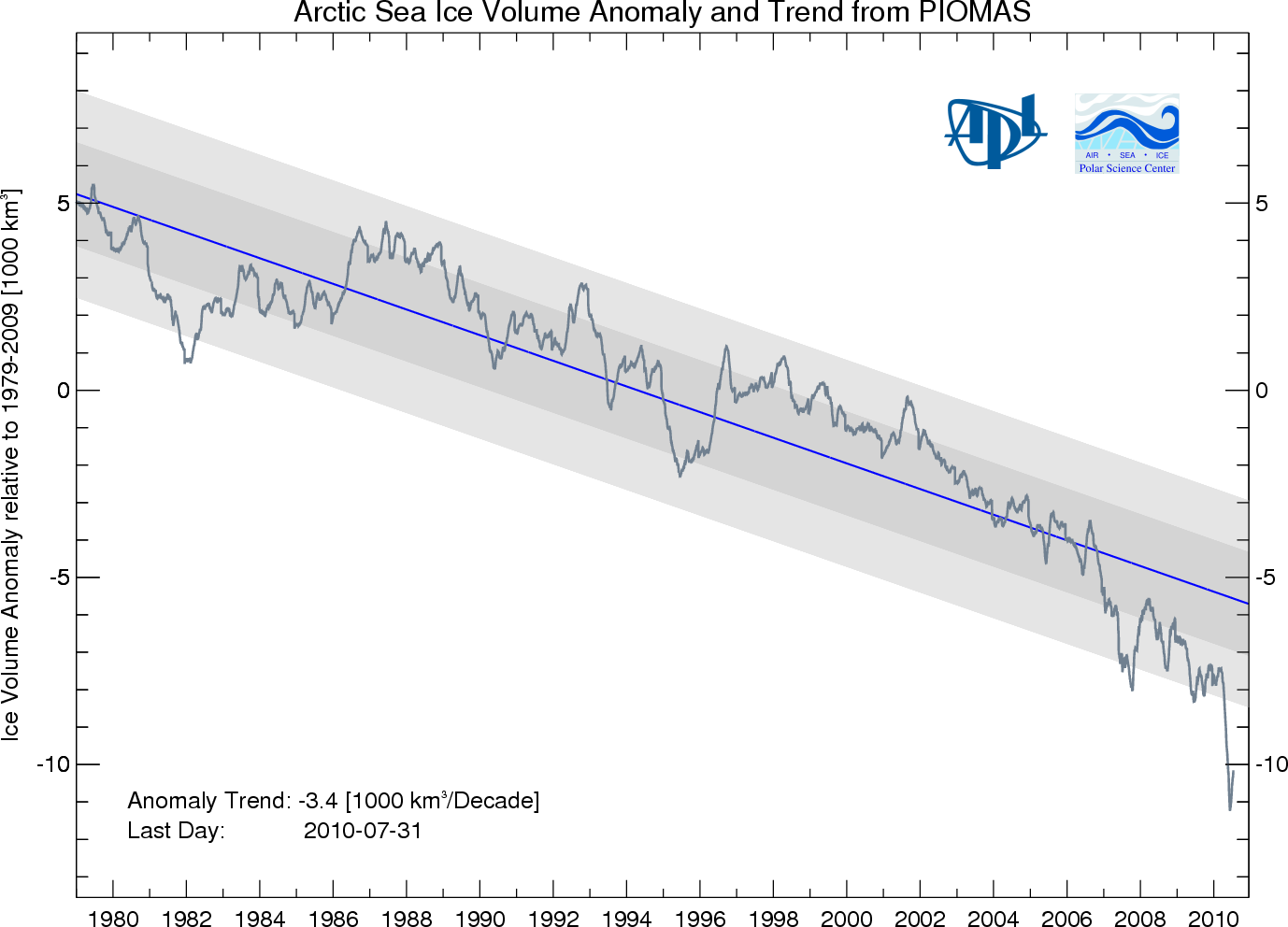 In this week’s most interesting post, Mr. Eli Rabett focused on ice and its crumbling, posting a scary graphic of the arctic sea ice volume anomaly. Ya see, the “skeptics” tend to focus on sea ice extent, claiming that whenever it increases, global warming is OVER! Of course, this is another example of cherry picking based on personal choice rather than science.
