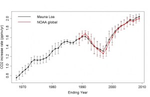 It is suggested that we did the test incorrectly, because a climate-extremist performed a similar test on the Mauna Loa CO2 concentration dataset and came up with a different result. However, as our detractors ought to have realized, the Mauna Loa dataset, taken from a single location intermittently perturbed by regional volcanic activity, is not the same dataset as the NOAA global dataset that we used. Accordingly, we are unimpressed by their reliance upon an entirely different dataset.