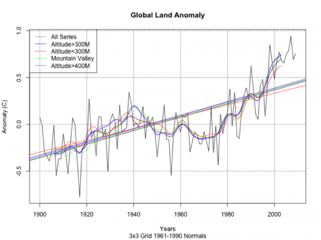 I am impressed by the efforts of these three to analyze the GHCN station drop outs in order to explore the claims made by Ross McKitrick in an earlier paper that due to a drop in altitude of stations, there was a warming of the record. Yet, at the same time, I can’t help but shake my head for all of this has been unnecessary and if the results of these and future investigations hold up, a waste of time that could have been spent on more productive projects. I directly lay the blame at the feet of the main skeptic/contrarians — McIntyre, McKitrick, Watts and their followers who have cast doubt on the temperature record through innuendo and outright claims of fraud and deceit.