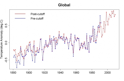 The results will probably be no surprise, since several others have replicated my results already, with the same outcome. Here’s the temperature history (annual averages) for pre-cutoff stations only, compared to that for post-cutoff stations only: